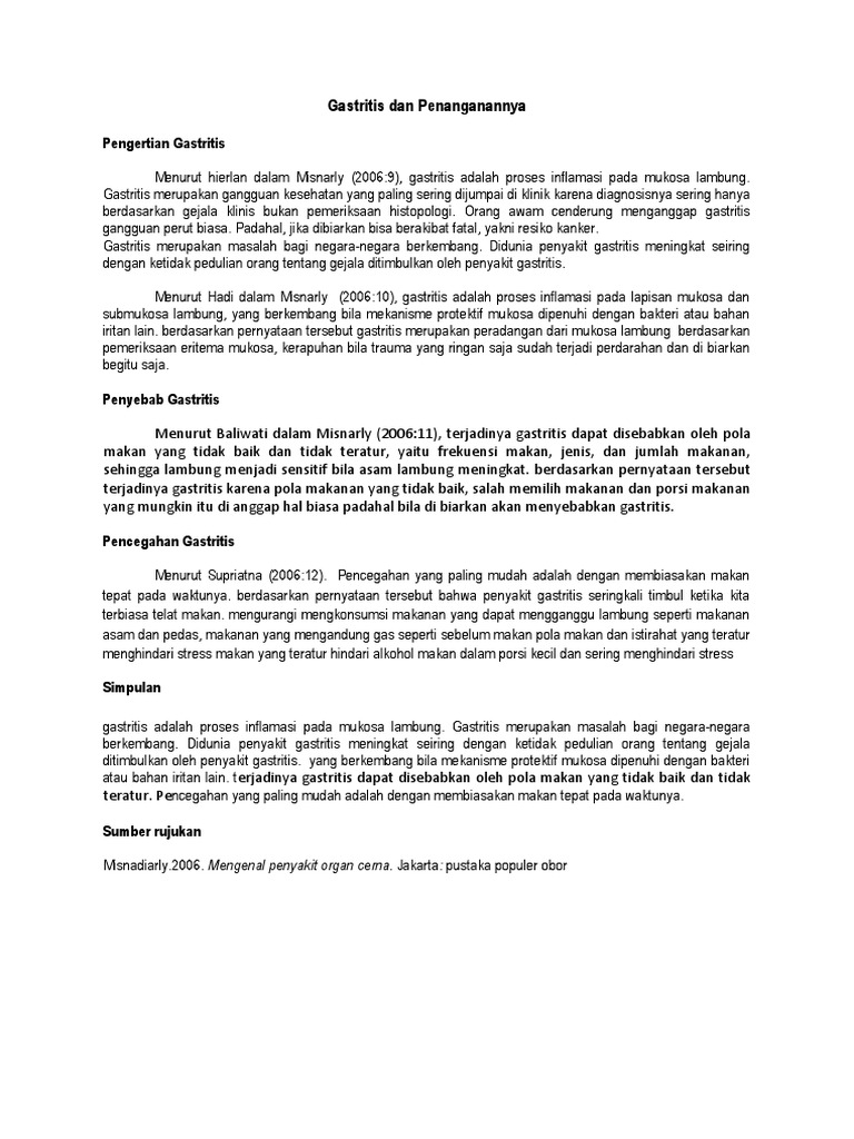 Definisi gastritis merupakan peradangan yang mengenai mukosa lambung. Gastritis dapat disebabkan oleh alergi makanan tertentu, racun, alkohol, dan. Gastritis merupakan salah satu yang paling banyak dijumpai klinik penyakit dalam pada umumnya. Pankreas merupakan salah satu organ di dalam sistem pencernaan manusia. Karena gastritis merupakan sebuah kondisi dan bukan penyakit, penyebab dasarnya perlu diketahui agar penanganan yang sesuai dapat dilakukan.